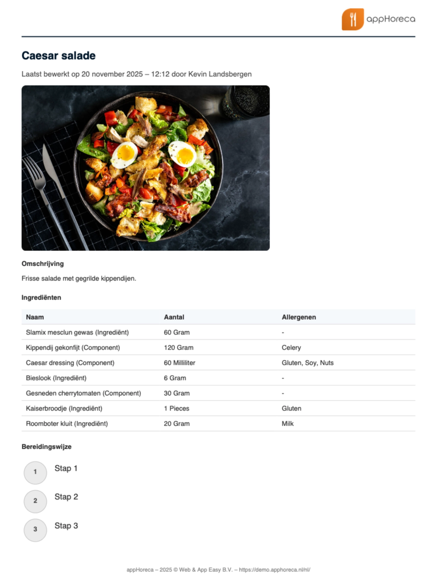 Met appHoreca genereer je eenvoudig een professionele allergenendeclaratie of receptuurkaart als PDF-bestand.